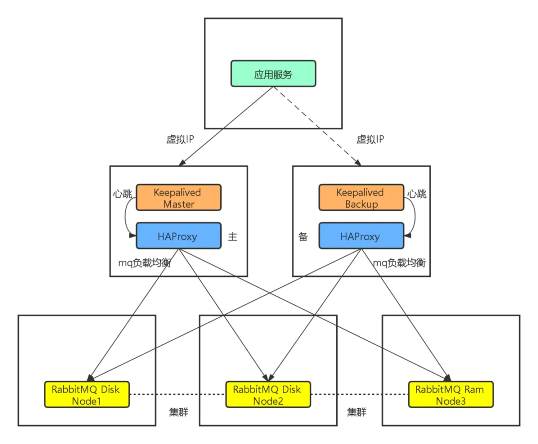 将两个 RabbitMQ 磁盘节点和一个 RabbitMQ 内存节点组成一个内建集群,之所以要用两个磁盘节点是防止,唯一的磁盘节点挂掉后,不能重建队列,交换器。用 HAProxy 作为 RabbitMQ 集群的负载均衡。为了防止 HAProxy 单点故障,用 Keepalived 将两个 HAProxy 节点做成一主一备。应用使用 VIP(虚拟IP) 访问 HAProxy 服务时,默认连接主机(Master)的 HAProxy,当主机(Master)上的 HAProxy 故障时,VIP 会漂移到备机(Backup)上,就会连接备机(Backup)上的 HAProxy 服务。