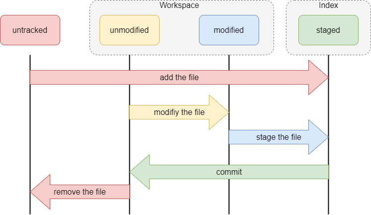 • 已修改(modified) 表示修改了文件,但还没保存到数据库中,目前在工作目录(Workspace)