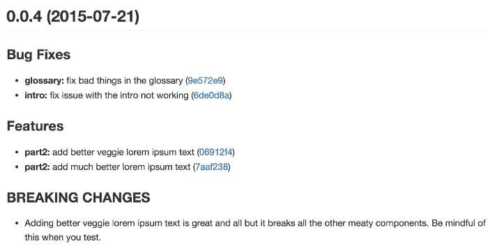 每个部分都会罗列相关的 commit ,并且有指向这些 commit 的链接。当然,生成的文档允许手动修改,所以发布前,你还可以添加其他内容。