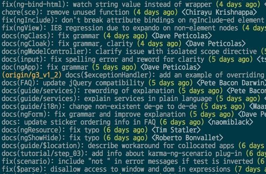 比如,下面的命令显示上次发布后的变动,每个commit占据一行。你只看行首,就知道某次 commit 的目的。