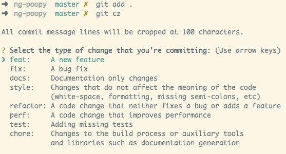 然后,在项目目录里,运行下面的命令,使其支持 Angular 的 Commit message 格式。