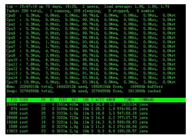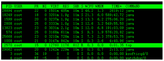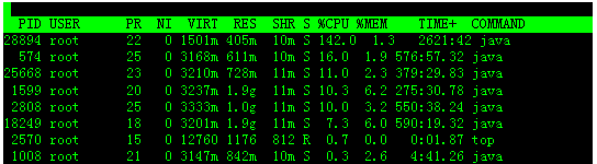 默认进入top时,各进程是按照CPU的占用量来排序的,在下图中进程ID为28894的java进程排在第一(cpu占用142%),进程ID为574的java进程排在第二(cpu占用16%)。